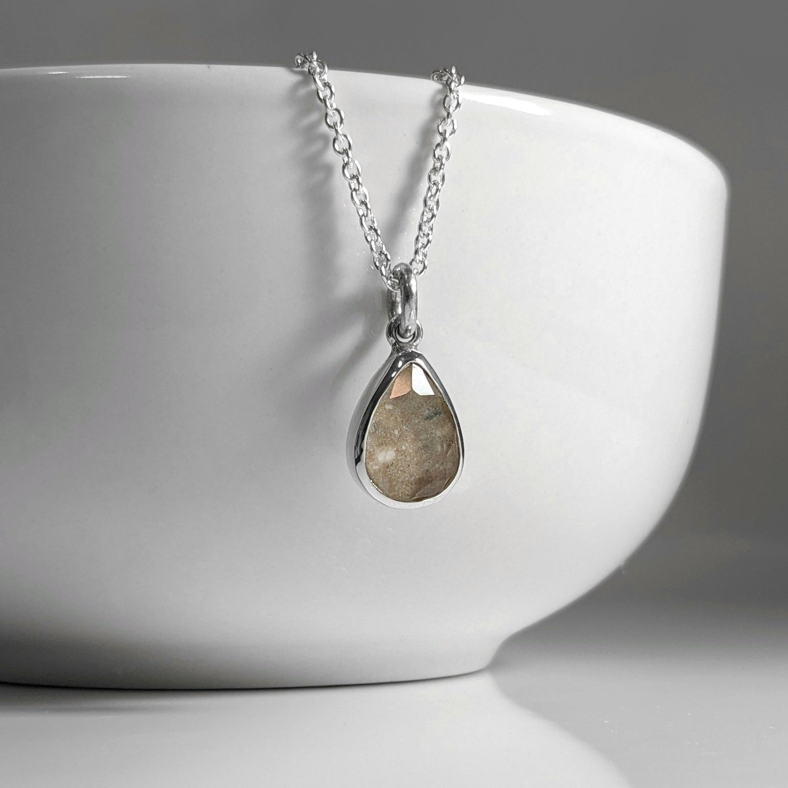 Featuring a pear-shaped gem, this is an heirloom quality necklace to carry through all of your days. With no sizing required, this necklace is the perfect choice for yourself or as a gift. Fully protected beneath hand-cut faceted artisan glass, and held securely within a bezel setting, your loved ones ashes (or other materials by special request) are turned into a stunning keepsake that is as unique as your memories. The back of your pendant is finished with your personalized engraving, which can comfortably fit up to two lines of 6 characters each (including spaces), although depending on the desired engraving more characters than this can often be accommodated, so please email prior to purchase to find out if your additional text can fit. The optional sterling silver chain adjusts from 16"-22" to ensure everyone can easily find their perfect length. You can have this pendant created in your choice of solid silver (fine + sterling), mixed metal (solid yellow or rose gold bezel with sterling backing and bail), or solid gold by special request.