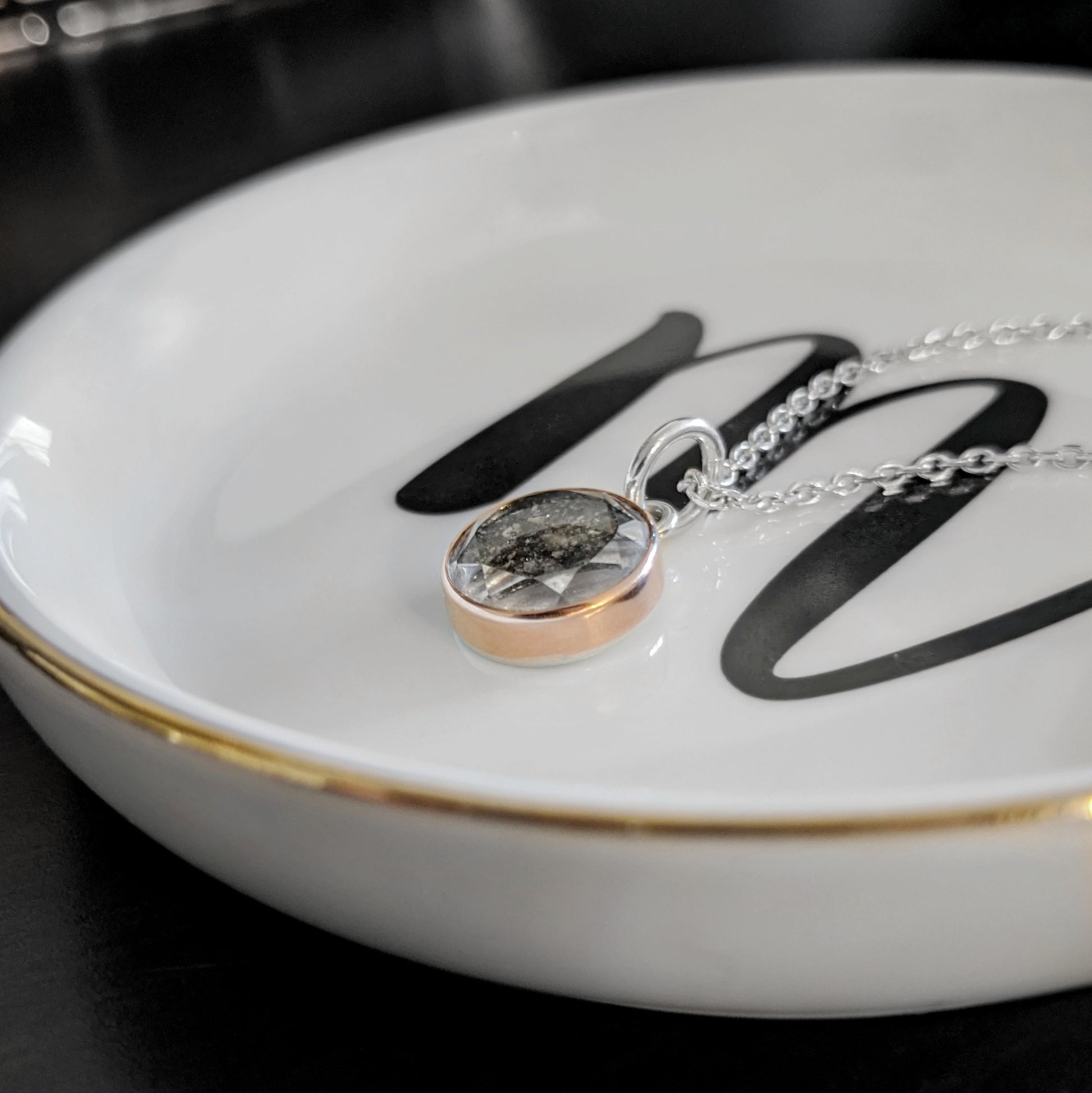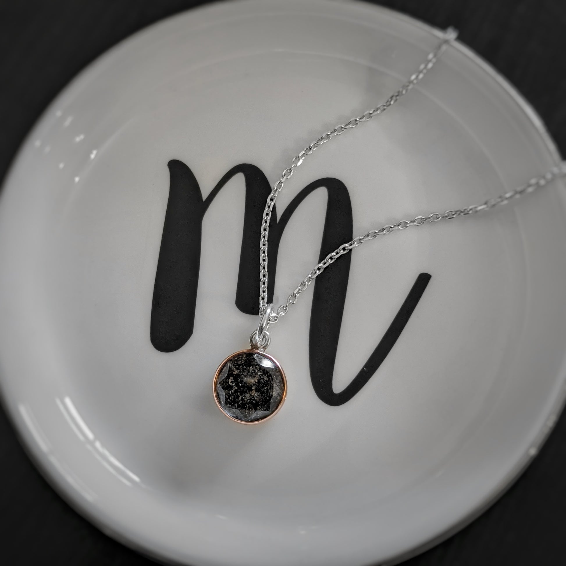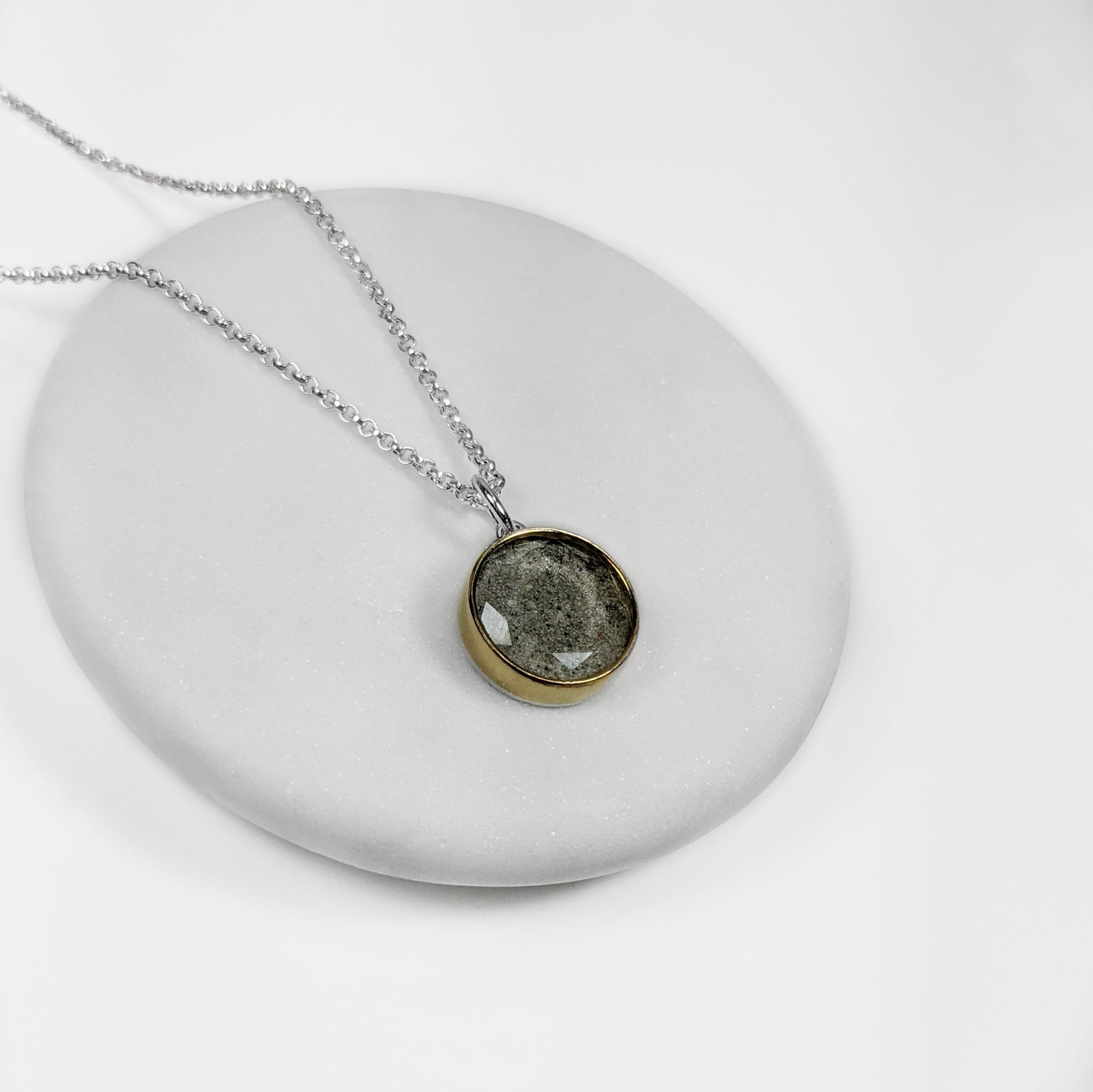 Featuring a classic round gem, this is an heirloom quality necklace to carry through all of your days. With no sizing required, this necklace is the perfect choice for yourself or as a gift. Fully protected beneath hand-cut faceted artisan glass, and held securely within a bezel setting, your loved ones ashes (or other materials by special request) are turned into a stunning keepsake that is as unique as your memories. The 12mm pendant can fit up to two lines of 8 characters each engraved on the back (including spaces), while the 16mm pendant can fit up to three lines of 12 characters each (including spaces). Depending on the desired engraving, more characters than this can often be accommodated, so please email prior to purchase to find out if your additional text can fit. The optional sterling silver chain adjusts from 16"-22" to ensure everyone can easily find their perfect length. You can have this pendant created in your choice of solid silver (fine + sterling), mixed metal (solid yellow or rose gold bezel with sterling backing and bail), or solid gold by special request.
