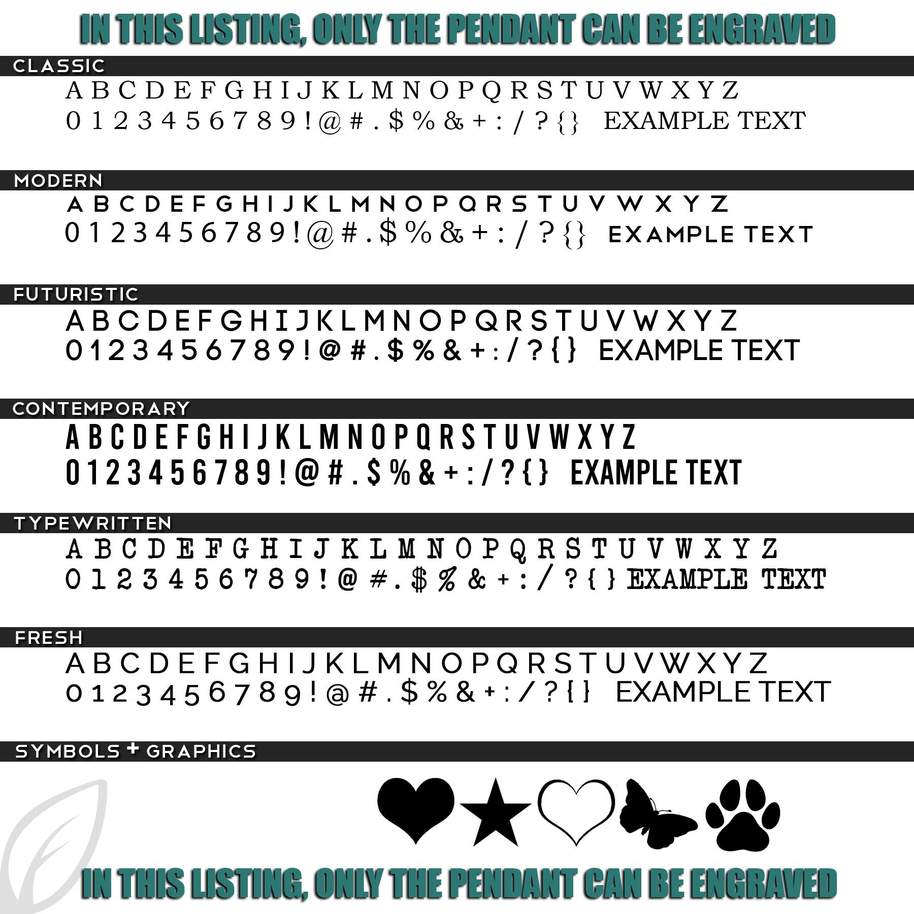 · Pendant: Includes 2 lines of 8 characters engraved on back
