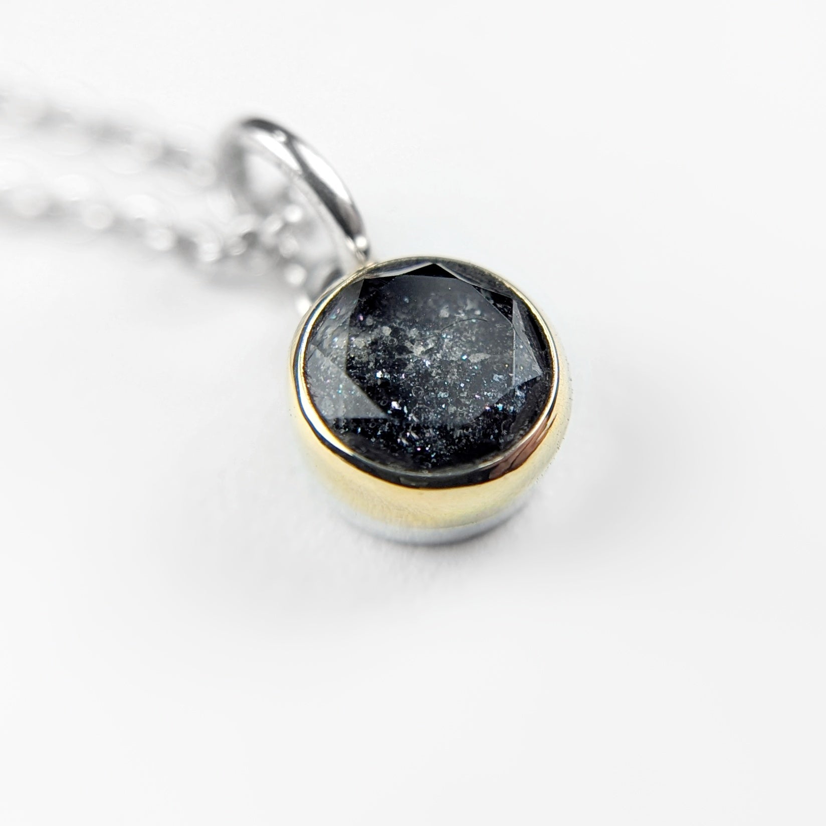 A mini version of the classic round heirloom necklace, perfect for those that would like a more petite memorial pendant. With no sizing required, this necklace is the perfect choice for yourself or as a gift. Fully protected beneath hand-cut faceted artisan glass, and held securely within a bezel setting, your loved ones ashes (or other materials by special request) are turned into a stunning keepsake that is as unique as your memories. This 8mm pendant can comfortably fit up to 3 characters engraved on the back. Depending on the desired engraving, more characters than this can often be accommodated, so please email prior to purchase to find out if your idea can fit. The optional sterling silver chain adjusts to ensure everyone can easily find their perfect length. You can have this pendant created in your choice of solid silver (fine + sterling), mixed metal (solid yellow or rose gold bezel with sterling backing and bail), or solid gold by special request.
